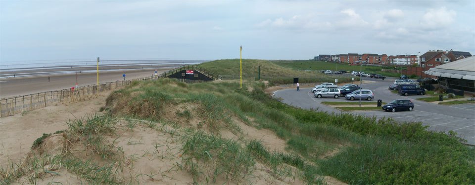 The picture actually features the Crosby Leisure Centre car park and is a little deceptive ‘cos parking for visitors to the beach is towards the back of the picture just opposite the Leisure Centre. And although it’s only a few yards from the promenade a large amount of blown sand on the pathways can often make things more difficult for disabled people.